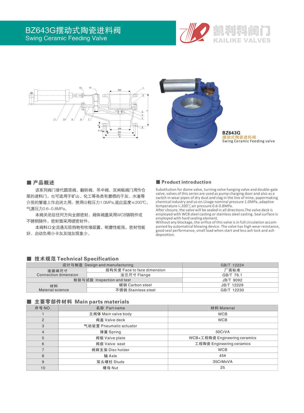 2、BZ643G擺動式陶瓷進料閥在關(guān)閉后任何方向全部密封。閥體閥蓋采用WCB鑄鋼件或不銹鋼鑄件。密封面采用硬密封件。